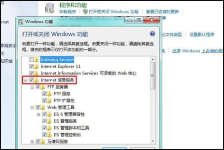 4、将‘Internet信息服务’下所有选项全勾上,然后点击‘确定’。稍等一会儿便可完成修改。