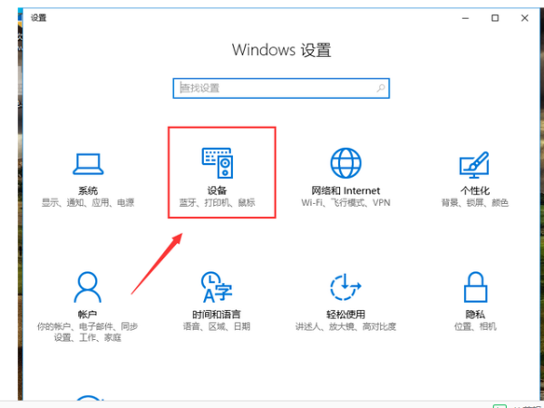 7、下面以Win10系统为例,打开桌面左下角的“windows图标”,找到“设置”选项,如图所示,点击打开。打开之后,找到“设备”选项,点击打开。