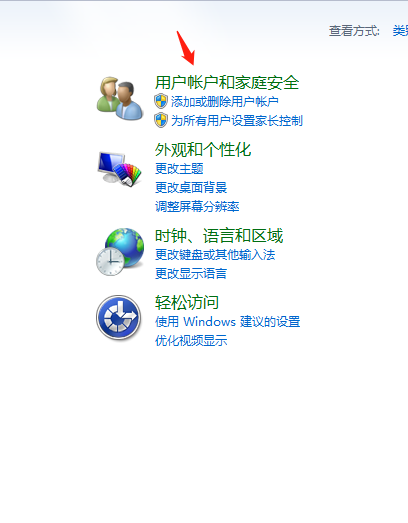 2.弹出“控制面板”窗口,查看方式切换到:类别,点击“用户账户和家庭安全”链接