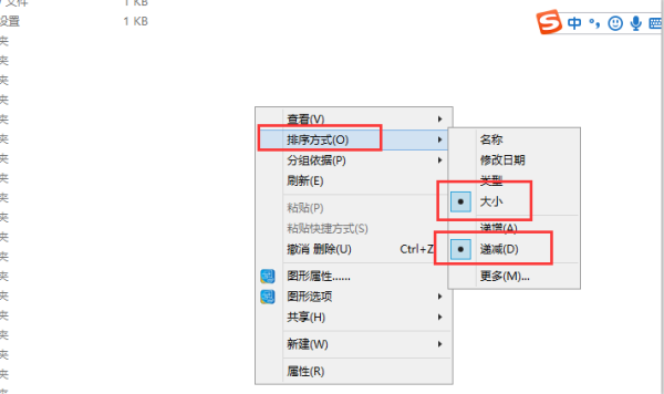 3、在打开的c盘中,在空白处右键单击,然后在出现的菜单中选择“排序方式”——“大小”和“递减”选项。