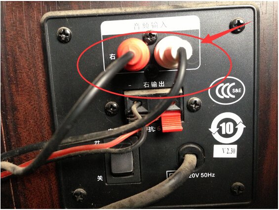 1、把红色线小音箱的插头插入主音箱的右声道红色音频输出孔(正常情况都是红右、白左)。