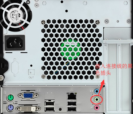 5、最后把连接线另一头黑色的插头插入机箱后面绿色插孔,就连接完成了。