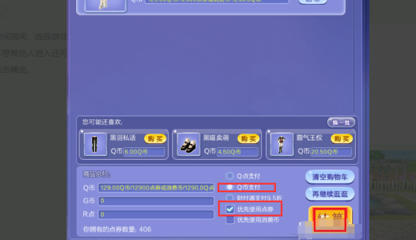 14.期限设置为【永久有效】,选择支付方式为“优先使用点券”,但是上方的圆形选项为必选,选择“Q币支付”,点击【结算】即可购买商品。