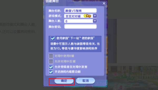 9.设置房间房间,选择游戏模式和舞台人数,若是不想其他人进入还可以设置房间密码,完成点击确定。