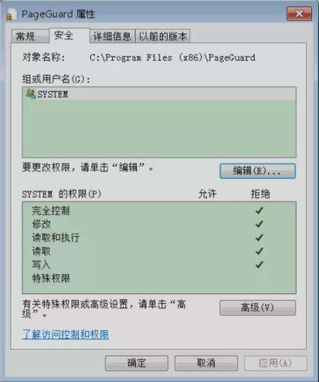 2、右键该文件夹“属性”打开如下图所示的操作界面选择上面的选项卡“安全”,鼠标定位到"SYSTEM“用户组在点击”高级“;