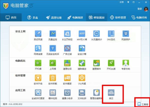 4,打开电脑管家——工具箱——微云——上传好文件,然后加密即可(而且电脑管家微云功能,现在免费送10T内存哦!)