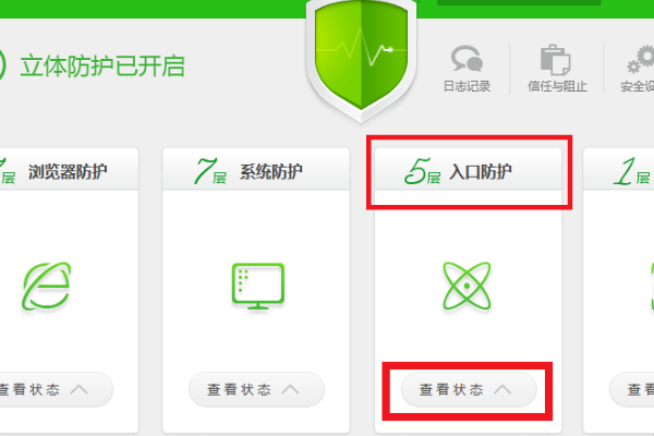 2、打开安全防护中心界面后,点击入口防护中的查看状态按钮。
