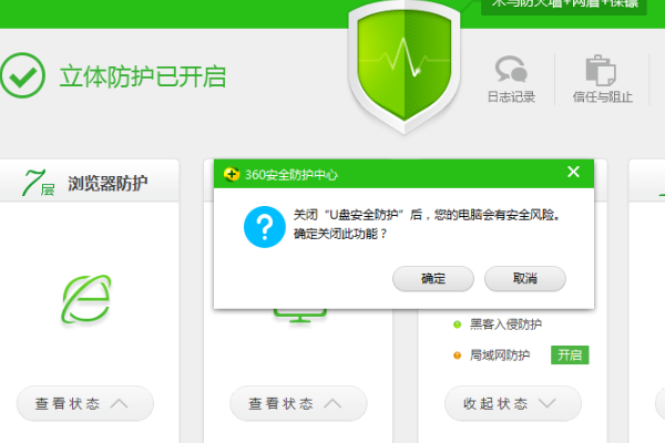 4、弹出一个对话框,关闭U盘安全防护后,您的电脑会有安全风险,确定关闭此功能。这个时候,点击确定就可以关闭360U盘保护了。