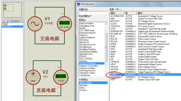 你问的是下图这样的吗?那确实是电源,有交流电源的直流电源的,所在的类别和名称如下图所示,画红圈的是元件名,有两个。proteus中的 电源是很多的,还有一些的。