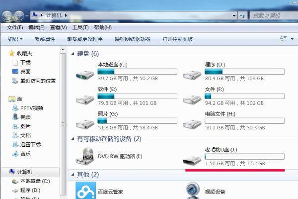 7、关闭计算机管理窗口,打开我的电脑:可见U盘盘符。