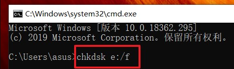 例如U盘在电脑上盘符为E,则键入“chkdsk e:/f”,然后按“Enter”键按钮,进入磁盘自检和修复。