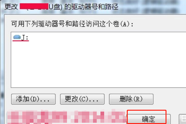 5、打开“更改驱动器号和路径”的对话框,在“分配以下驱动器号(A)”的右边下拉列表里,输入分配给U盘的驱动器号,如:J,点确定。