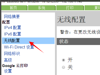 3、然后点击选中右边状态下的【开启】,开启无线配置。