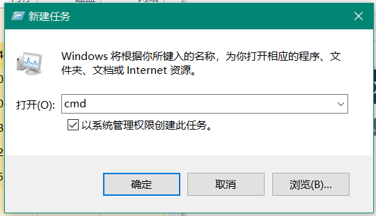 勾选“以系统管理权限创建任务”,输入“cmd”打开