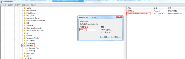 2、在右侧编辑框空白处单击右键——新建——DWORD(32-位)值(D),名称设置为DefaultSecureProtocols——双击新创建文件——基数保持默认16进制,“数值数据”设置为“a00”。