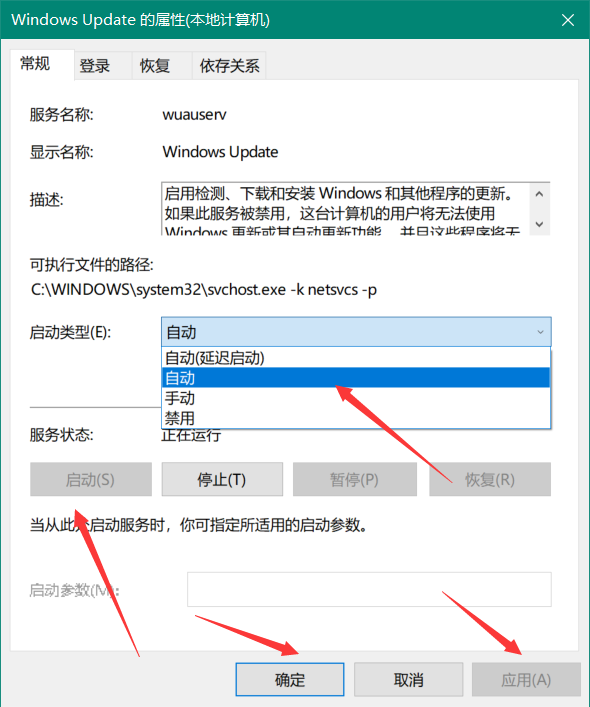2.在右边服务窗口中找到“windows update”双击进去,在属性面板中,启动类型改为“自动”,服务状态改为“启动”。