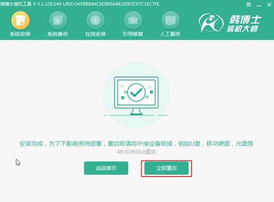 6,下载文件后,韩博士将部署并安装环境。成功部署环境后,将弹出一个重启窗口。单击“立即重新启动”,或等待计算机自动重新启动。