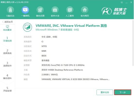 2,韩博士在计算机上进行环境测试。然后显示计算机的配置信息。如果感觉不对,请单击“重新测试”,否则单击“下一步”。