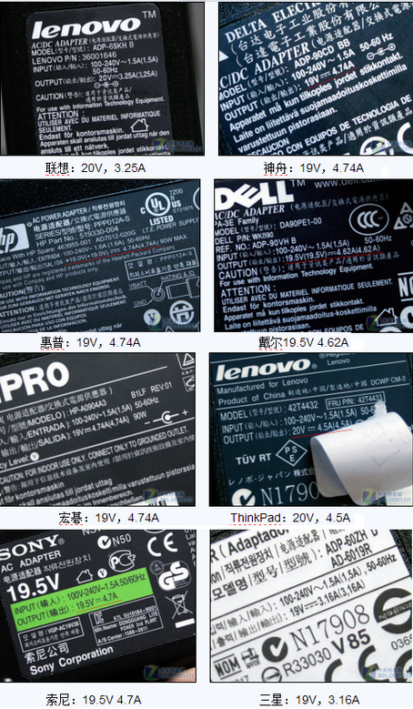 二、下面是联想、宏碁、联想ThinkPad、神舟、戴尔、惠普和三星等常见品牌笔记本电源适配器的参数图片;