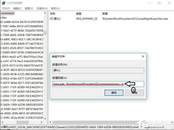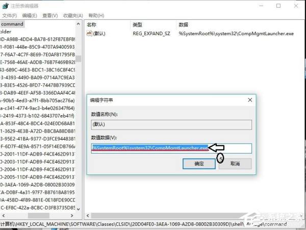 6、在弹出”编辑字符串“的对话框中,更改”%SystemRoot%\systme32\CompMgmtLaucher.exe“更改为”mmc.exe %systemroot%\system32\compmgmt.msc /s“,若是更改成功,则修复故障成功;若是弹出以下对话框(如第3图),则应更改相关配置,更改权限来更改,其过程如下;