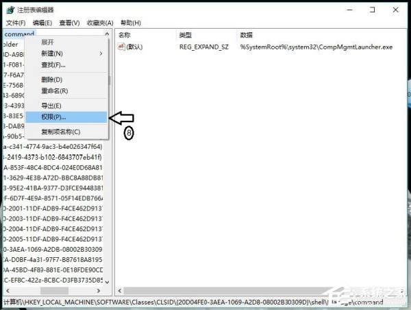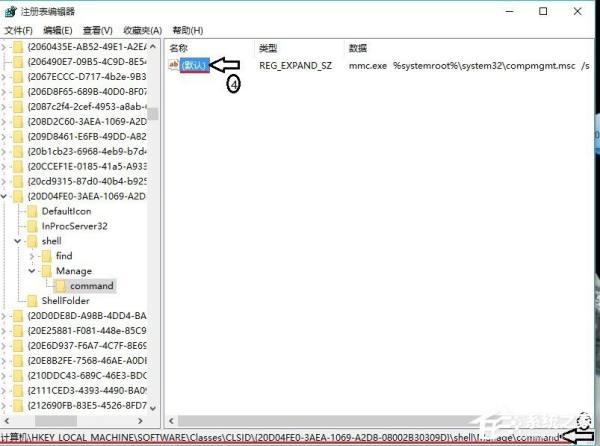 5、在弹出”注册表“对话框中依次选择”HKEY_LOCAL_MACHINE““SOFTWARE”“Classes”“CLSID”“20D04EF0-3AED-1069-A2D8-08002B30309D”“shell”“Manage”“command”,双击”默认“按钮;