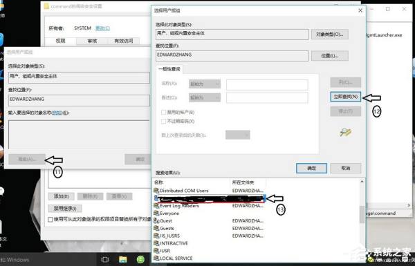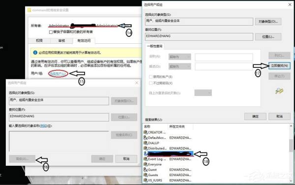 11、选择”有效访问“单击”选择用户“在弹出的”选择此对象类型“单击”高级“,在弹出的”选择用户或组“对话框中,单击”立即查找“按钮,双击自己电脑的用户名,更改自己使用账户的权限为”完全控制“;