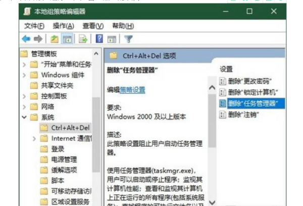 2、在组策略编辑器左侧窗口,依次展开:用户配置—>管理模板—>系统—>Ctrl+Alt+Del选项,在右侧窗口中,找到并双击打开名称为删除“任务管理器”的项目