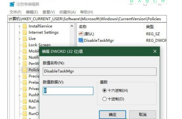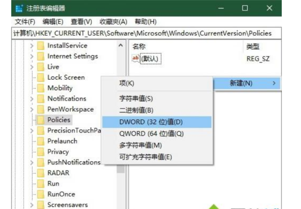 2、在注册表编辑器左侧窗口,依次展开并并定位至:HKEY_CURRENT_USERSoftwareMicrosoftWindowsCurrentVersionPolicies,在右侧窗口查看有没有名称为DisableTaskMgr的Dword(32位)值,如果没有,就右键新建一个Dword(32位)值