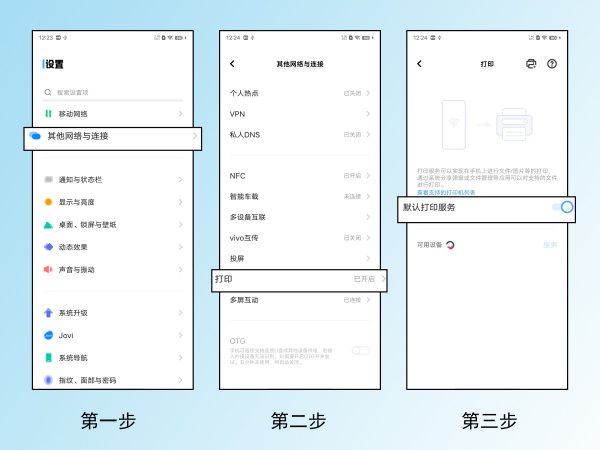 进入设置--其他网络与连接--打印,开启默认打印服务,在可用列表选择要连接的打印机,点击连接,进行打印;