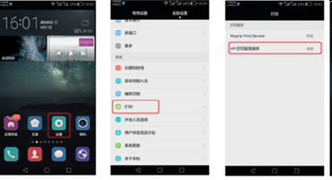 2.如果是不支持 Mopira 服务的打印机,请安装该打印机对应的打印 APP 或插件(可以咨询对应打印机的客服,确认安装哪款 APP 或插件),安装成功后,可以在“设置 > 打印” 中看到该打印机服务,点击开启即可。图例: