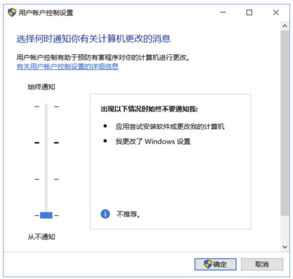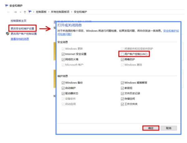 或者【Win】+【Q】调出搜索框,搜索并进入【安全和维护】,选择【更改安全和维护设置】,取消勾选【用户账户控制】。若有【smartscreen筛选器】,也选择不执行任何操作。