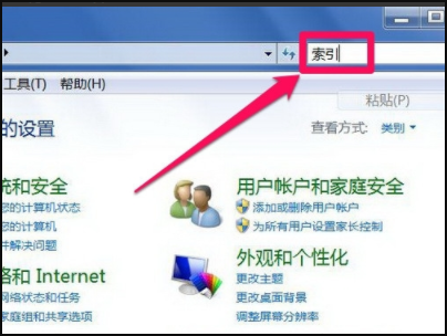 2、在控制面板窗口,找到搜索框,输入“索引”两字,就会自动开始搜索。