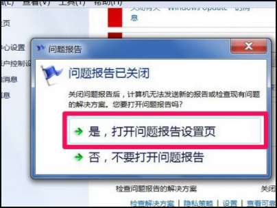 5、如果之前优化过系统,就会弹出提示“问题报告已关闭”,如果要继续修复,按“是,打开问题报告设置页”进行修复就完成了。