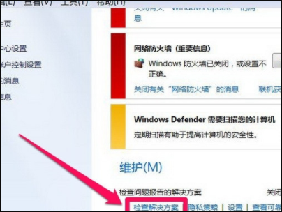 4、在操作中心窗口,先在右侧窗口选择“维护”这一项,然后展开其界面,在下面,找到并选择“检查解决方案”。