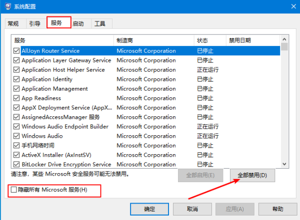 4、在打开的界面中,定位到上方的服务,勾选隐藏所有服务,再点击全部禁用。