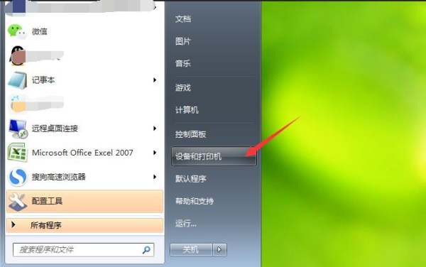 1、在电脑端左下角开始位置选择开始菜单,选择【设备和打印机】选项按钮。