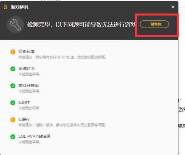然后就会自动打开“LOL游戏修复”界面,待检测完成LOL运行环境后。然后就可以再次尝试运行LOL客户端程序了;