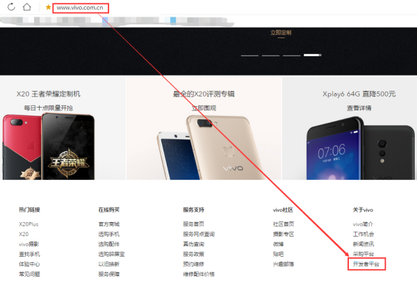 1、访问vivo官方网站,点击页面下方的开发者平台