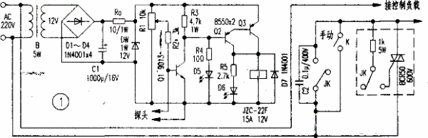 Rl应选精密密封实芯小型电位器,R2调好后要换成固定电阻,调试时可在探头插入处缓慢滴入水,当土壤湿润程度认为满足要求时,调节Rl使其Q1截止。然后用电吹风对探头部位土壤进行烘干。当觉得又应浇水时,再减小R2,使其探头两端电压上升,并让Q1导通而接通控制电路。反复几次,直至浇水达到要求后能自动关断,缺水时又能自动接通为好。当负载功率较大(例如>3kW)时,可按图l虚线部位接人双向可控硅,而让JK的常开触点控制触发极。可控硅平均电流要大于4—5倍负载额定电流(在安装散热器的情况下)。这是因为电机为感性负载,启动电流较大,可控硅反压要大于2倍负载所需的额定电压。其余元件无特殊要求,见图l标注。整个控制部分可装在一个自制的小盒中,而让指示二极管露出盒外即可。