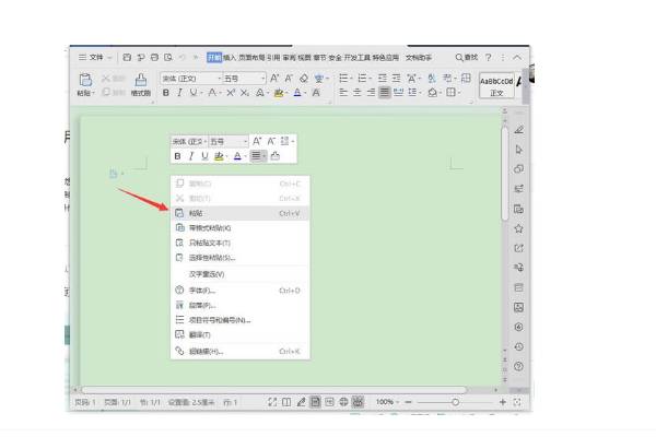 4、接下来在需要粘贴文字的地方单击鼠标右键,在弹出的对话框列表中选择红色箭头所指处的“粘贴”。