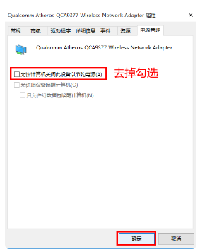 3,我们在打开的无线设备属性页面中,点击选择【电源管理】选项,然后取消勾选【允许计算机关闭此设备的电源】,点击确定按钮即可。
