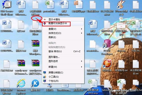 鼠标右键单击电脑桌面空白处,选择“配置可交换显示卡”或者选择显卡属性里面设置。举一反三,只要进入显卡交换设置选项界面就可以了。