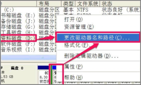 5、删除后,选择“数据盘”->右键单击->更改驱动器名称和路径。这次,选择“添加”按钮。
