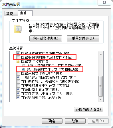 3、点击查看选项卡,点击取消勾选隐藏受保护的操作系统文件,点击显示隐藏的文件、文件夹和驱动器;