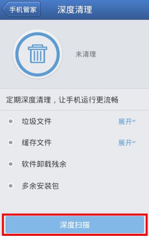 1. 安装腾讯手机管家并进入界面,在健康优化中找到深度清理一栏:
