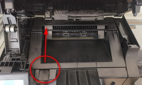 1、请打开机器后盖,重新关闭定影单元盖板;