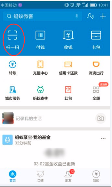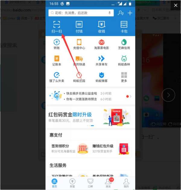 三、点击支付宝首页扫一扫图标,扫描纸上二维码,按提示绑定,激活“赚钱红包”。