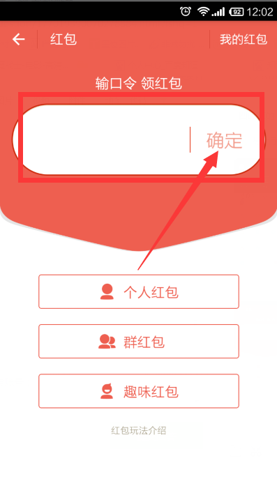 在文本框里直接输入口令,点击“确定”即可参与相应的抢红包的活动。