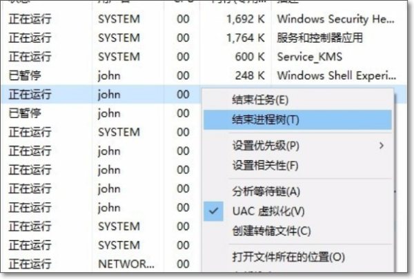 5、在进程上点击鼠标右键,关闭掉进程树,如图所示。