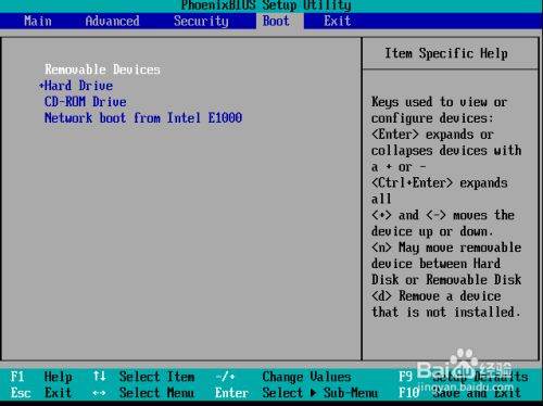 ②、硬盘没问题的话,可能是你使用过U盘,但没有拔下来,而BIOS里面可能设置了U盘启动优先于硬盘启动,所以你需要拔掉U盘再重启。如果不需要U盘启动,可以在BIOS里面查找一下启动顺序,将U盘启动放到硬盘启动后面去,有些BIOS是直接取消。图中硬盘启动Hard Drive在第二项,最优先的是可移动设备Removable Devices,第三顺位是光盘启动,第四顺位是网络启动。